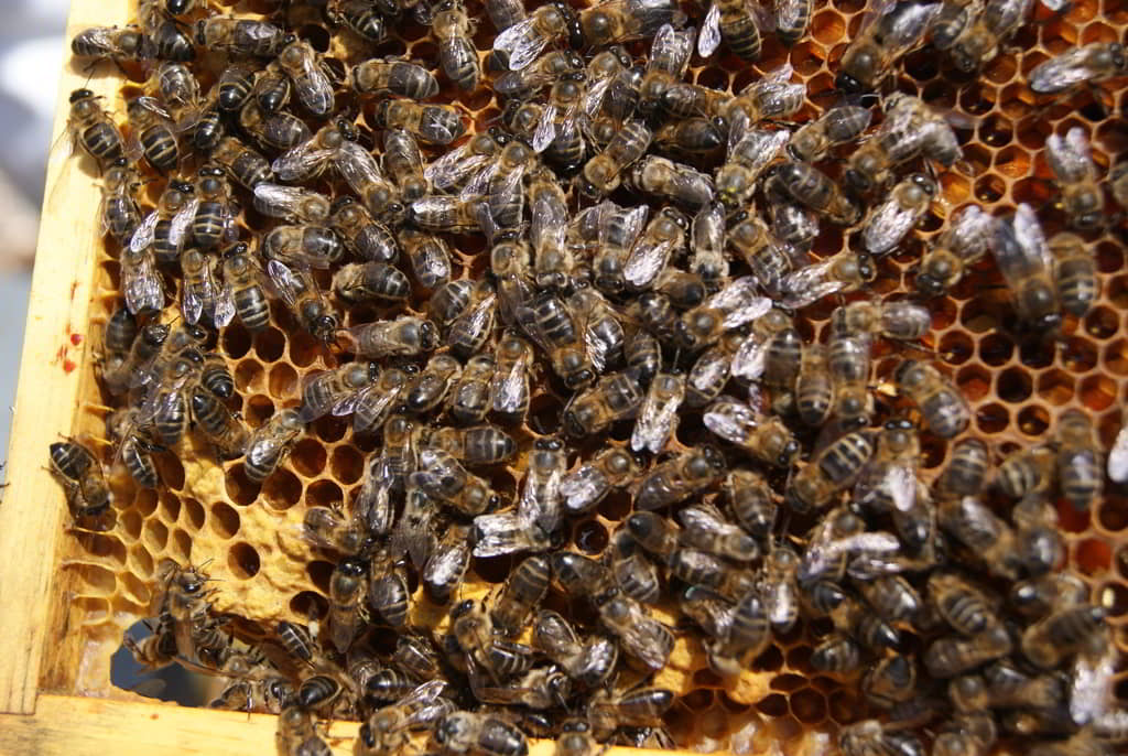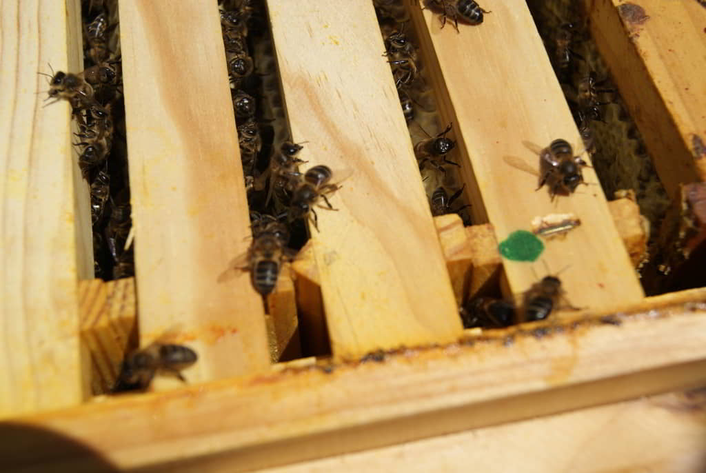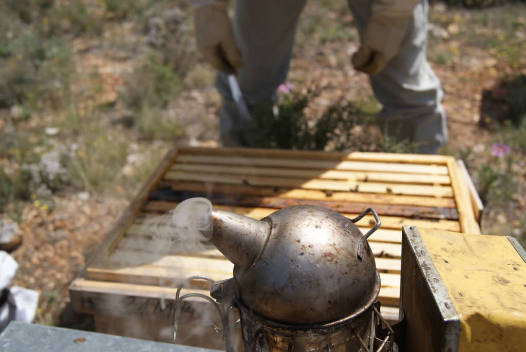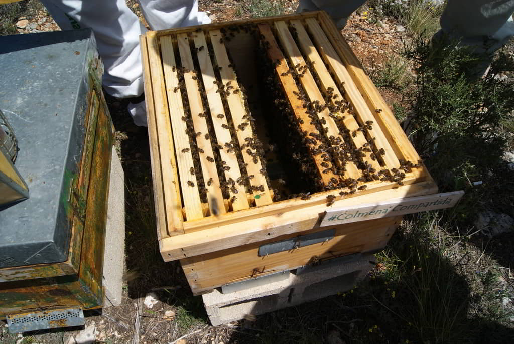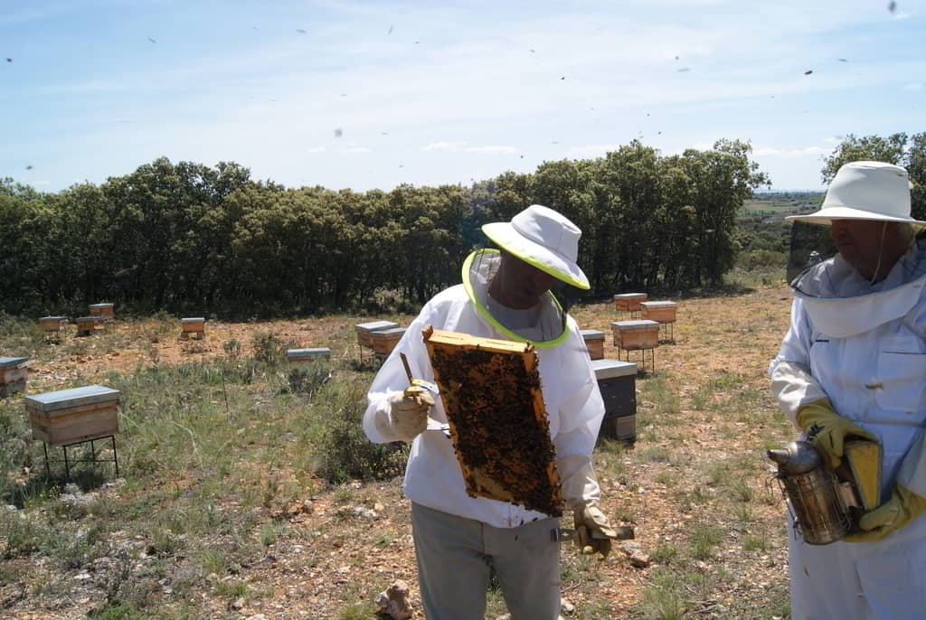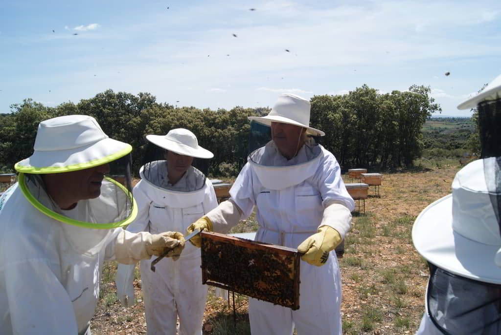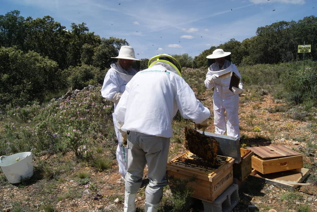 Tras una explicación inicial sobre el trabajo que realizan, la importancia de las abejas para nuestro entorno y los entresijos del proceso de obtención de miel, nos pusimos los trajes y fuimos a visitar algunas de las colmenas. Ayudamos en la medida de nuestras posibilidades a los trabajos de revisión del estado de las colmenas mientras nos explicaban in situ los procesos que íbamos realizando: ahumado para tranquilizarlas previamente, búsqueda de reinas, revisión de la salud de la colmena, búsqueda de enfermedades, etc. También aprendimos a distinguir la abeja española de la italiana y, sobre todo, aprendimos a respetar a las abejas y a maravillarnos por su organización y capacidad de trabajo.