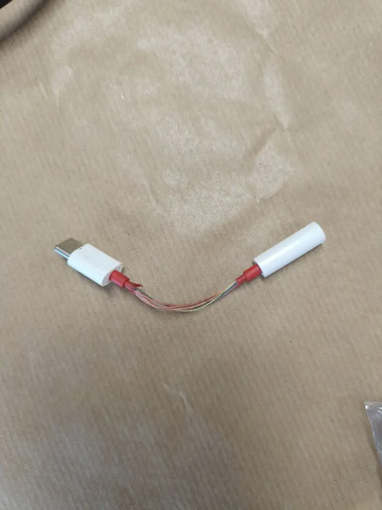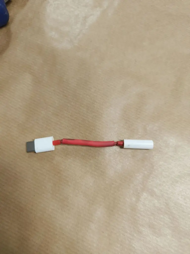 Por otro lado, teníamos un cable USB-C a mini-jack de audio que tenía el recubrimiento de plástico abierto, así que le pusimos uno nuevo, no fue una reparación dificil ya que el cable no fallaba, pero se consiguió reforzar para que dure mucho más!