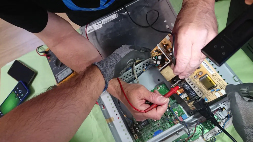 Y por último tuvimos un aparato muy desafiante, era un monitor que funcionaba solamente cuando estaba caliente, en frío no encendía. Hubo diferentes opiniones de lo que podía pasar, desde luego era algún componente electrónico en mal estado pero no era fácil ver cuál. Un fallo habitual viene de los condesadores electrolíticos, se suele ver a simple vista cual está deteriorado porque se ve hinchado o con algo de líquido fuera, pero a simple vista no vimos nada raro en los condensadores. Hicimos una comprobación de entrada de corriente e iba bien.